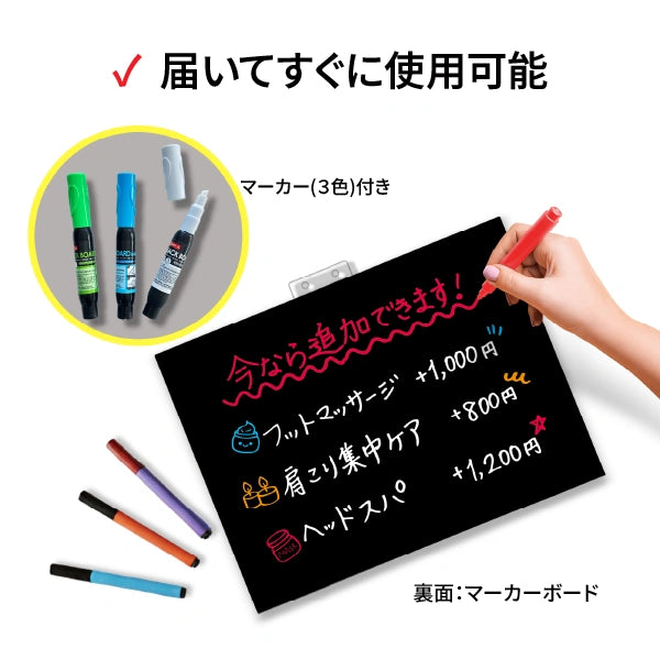 両面を活用して、日替わりメニューやキャンペーン情報を自由に表示できます。